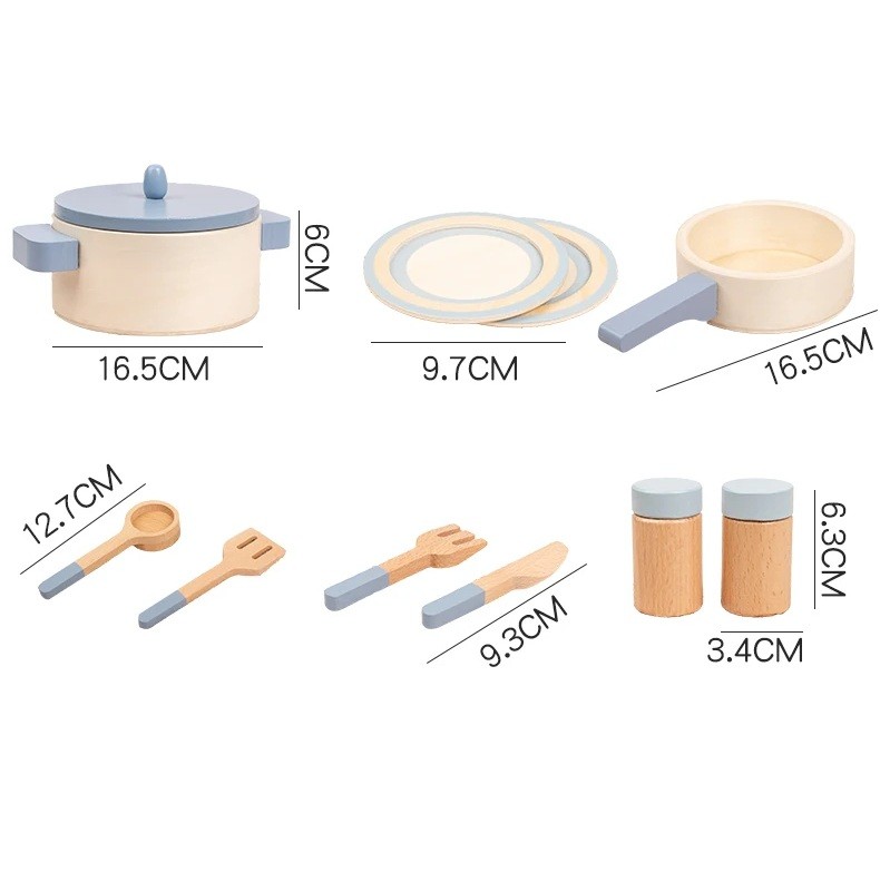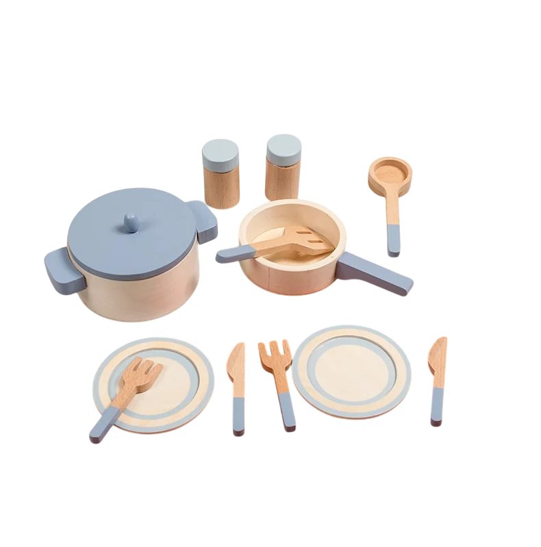 Set de bucătărie din lemn pentru copii Jucărie albastră cu set de tigăi, oale și tacâmuri jucărie educațională Montessori pentru gătit și jocuri de rol ca bucătar șef