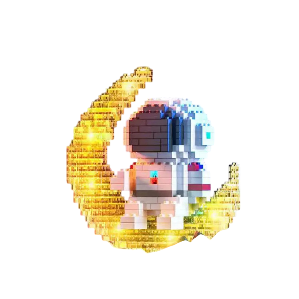 Această set de construcție detaliat surprinde un astronaut stând pe o lună de aur creată din mini blocuri galbene transparente. Combinația de costum deschis cu detalii albastre, roșii și gri-negru conferă modelului un aspect distinctiv și totodată delicat. Dimensiunea 9,3 x 9,2 x 4,5 cm oferă o dimensiune suficientă pentru expunerea pe birou, raft sau în camera copiilor, fără a ocupa mult spațiu. Întregul model are un efect vizual datorită contrastului dintre astronautul alb și baza strălucitoare de aur. Setul de construcție este potrivit ca decorație, cadou sau proiect creativ de construcție.