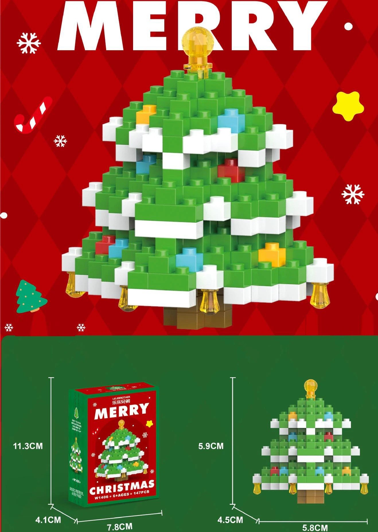 Setul de construcție a bradului de Crăciun din micro cărămizi este un accesoriu minunat pentru orice decor festiv. Modelul este alcătuit din 147 de cărămizi din plastic rezistent, care formează un brad de Crăciun verde, realist, decorat cu lumini colorate și încheiat cu o stea aurie. După asamblare, bradul are dimensiunile 5,8 x 4,5 x 5,9 cm, în timp ce cutia măsoară aproximativ 7,8 x 4,1 x 11,3 cm. Datorită dimensiunii sale, este potrivit ca un cadou mic, decorațiune de Crăciun sau accesoriu pentru alte modele mini din serie.