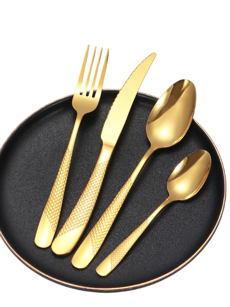 - Setul include cuțite, furculițe, linguri de masă și lingurițe de desert