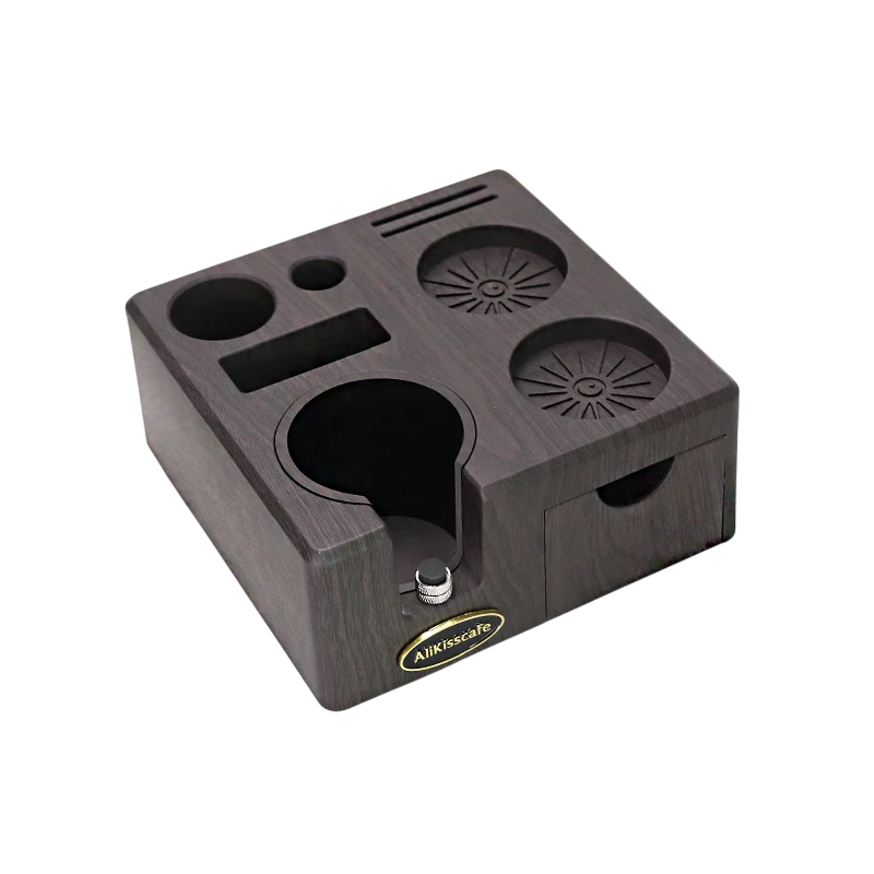 Aceast suport practic pentru accesorii de cafea este soluția ideală pentru oricine dorește să își păstreze colțul de barista întotdeauna organizat și curat. Este fabricat din plastic ABS solid și rezistent, care garantează o durată lungă de viață și o întreținere ușoară. Dispunerea bine gândită oferă loc pentru două tamperi, un portafiltru, filtre și două perii, astfel încât să aveți toate uneltele importante mereu la îndemână. Datorită sertarului integrat, puteți depozita cu ușurință accesorii mici, cum ar fi garnituri, lingurițe sau inele. Dimensiunile compacte și designul modern îl fac un accesoriu elegant pentru orice loc de muncă dedicat cafelei.