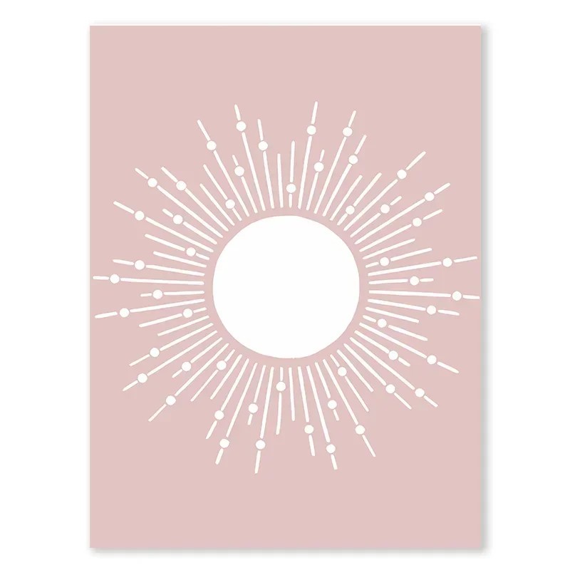 Plakat decorativ pentru perete cu motivul soarelui alb pe fundal roz reprezintă un accesoriu stilat pentru camera copiilor. Designul minimalist în combinație cu culorile pastelate delicate creează o atmosferă plăcută și liniștitoare. Motivul soarelui simbolizează bucuria, energia și o stare de spirit pozitivă, contribuind la crearea unui mediu armonios, potrivit atât pentru odihnă, cât și pentru joacă. Tabloul este imprimat pe o pânză de calitate, care păstrează intensitatea culorilor și detaliile clare. Datorită formatului său universal, se potrivește ca accesoriu deasupra patului, biroului sau comodei pentru copii.
