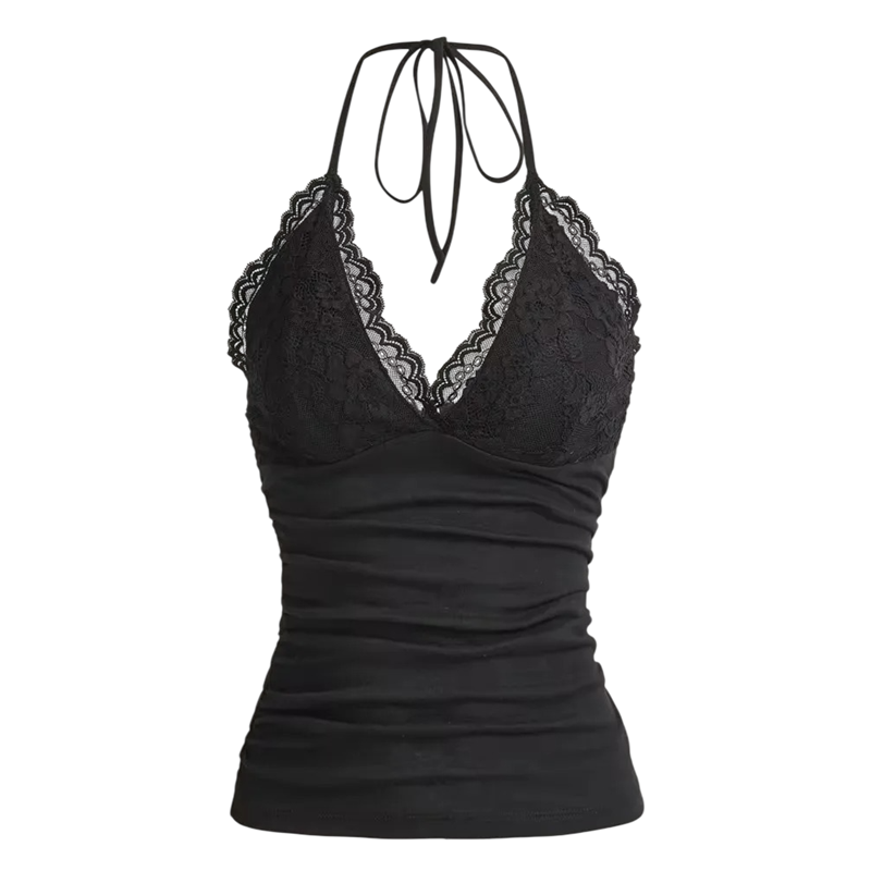 Pagina de start Pagina de start Îmbrăcăminte şi accesorii Femei Maiouri de damă Top damă din dantelă cu bretele subțiri Decolteu în V Legare la gât Top elegant uni din poliester și spandex