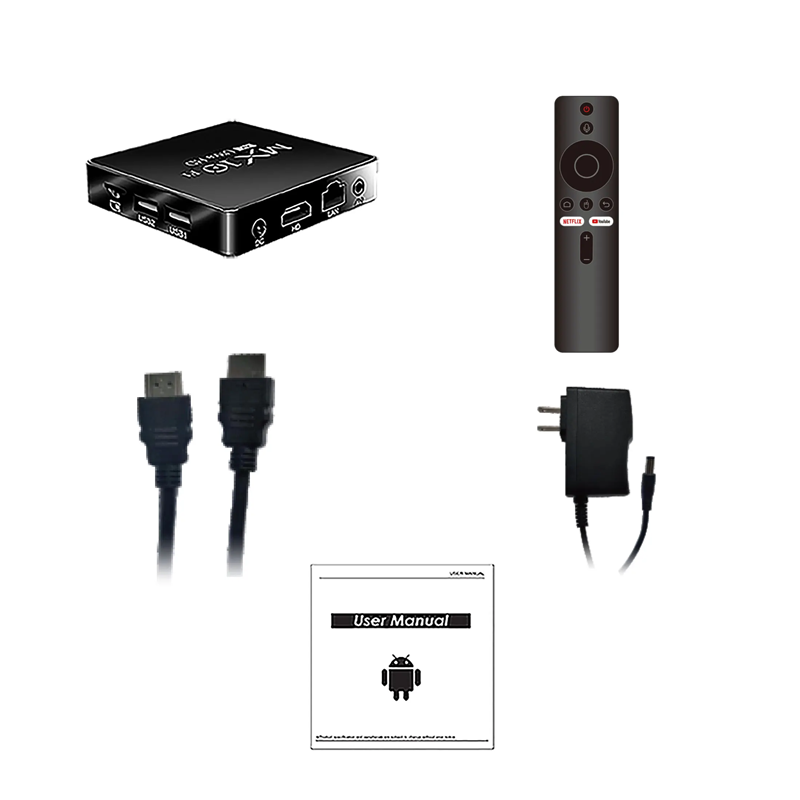 Conținutul pachetului: TV box, cablu HDMI, telecomandă, adaptor de alimentare, manual de utilizare