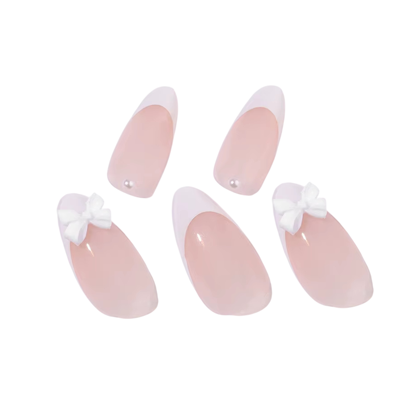 Unghii artificiale de migdală de dimensiune medie 24 buc Nalepici cu vârfuri franțuzești cu acoperire completă 3D fundițe și perle Manichiură acrilică DIY pentru femei