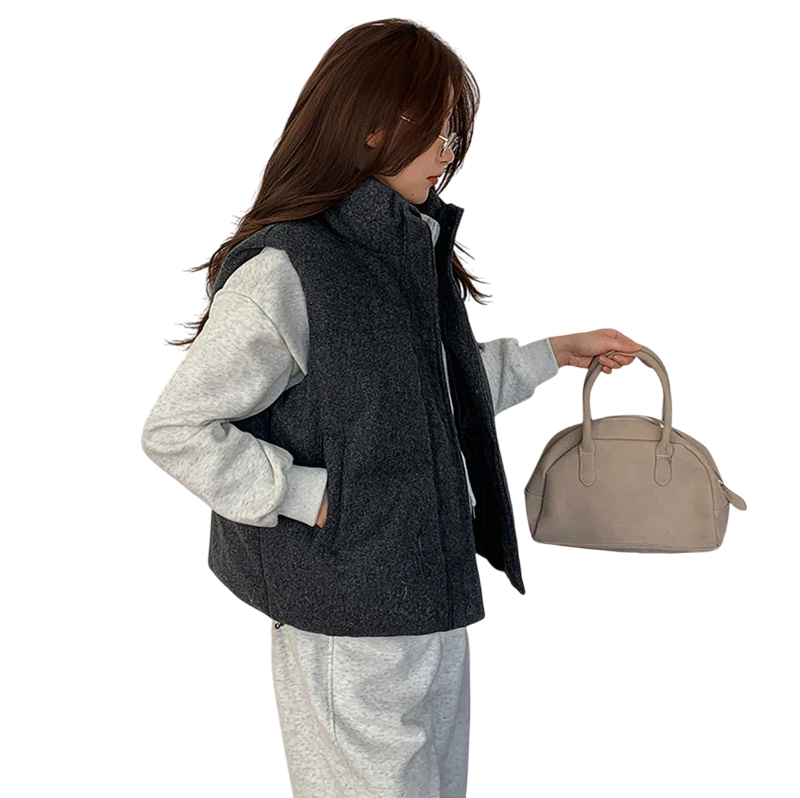 Vesta de iarnă pentru femei cu guler înalt și închidere cu fermoar Vesta călduroasă într-o singură culoare cu buzunare din bumbac și poliester Accesoriu stilat pentru zilele reci